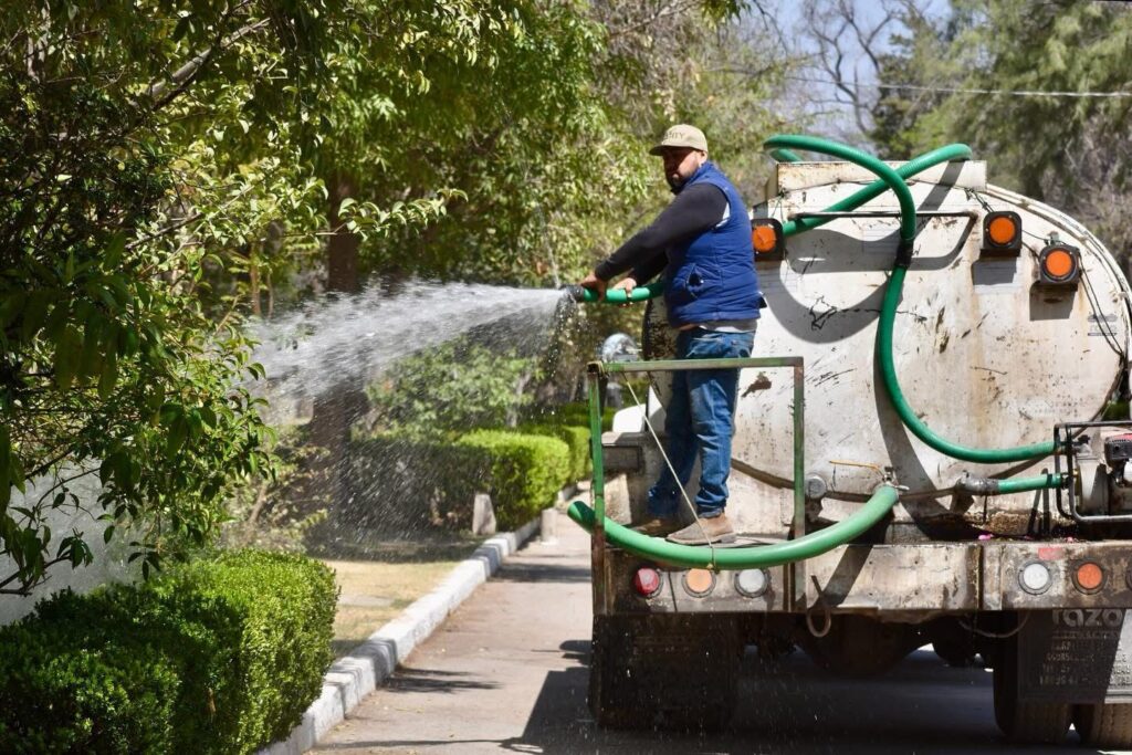 Ante la necesidad de cuidar al máximo el agua disponible por la falta de lluvia y el aumento de la temperatura en los últimos días, el Gobierno Municipal ha intensificado el riego de jardines, camellones y áreas verdes de la ciudad con agua tratada, para que el agua potable sea destinada únicamente al uso doméstico.