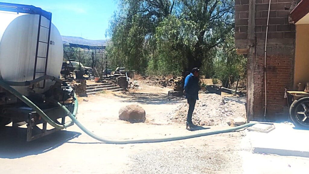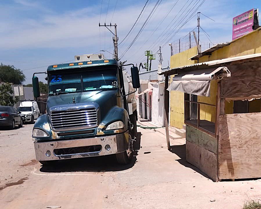 SLP.- Habitantes de la fracción Cañada del Lobo que se ven afectados por la falla de “El Realito” fueron atendidos este miércoles por INTERAPAS, llevando agua en camiones cisternas a sus viviendas para su almacenamiento.