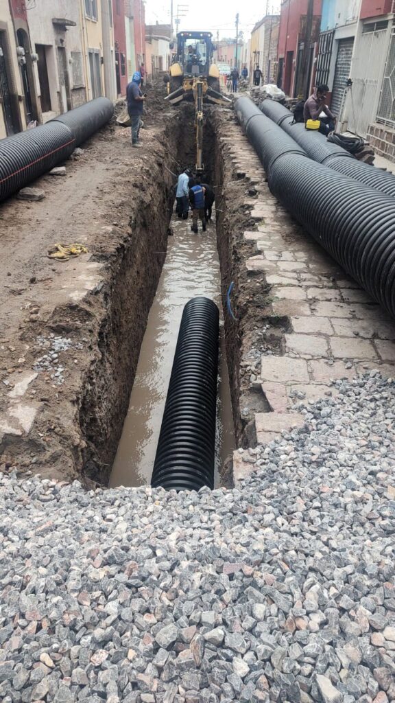 Las acciones se han realizado en turnos diurnos y nocturnos, e incluyeron trabajos de excavación, retiro de tubería colapsada y desalojo de aguas negras, así como el afinado del fondo de la zanja para garantizar la correcta pendiente hidráulica y nivelación de la vialidad.