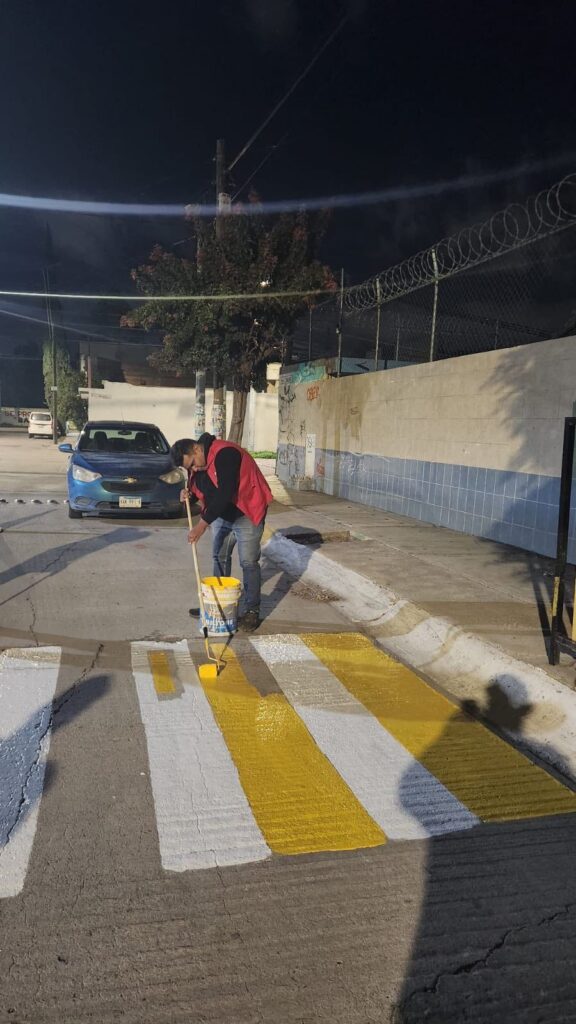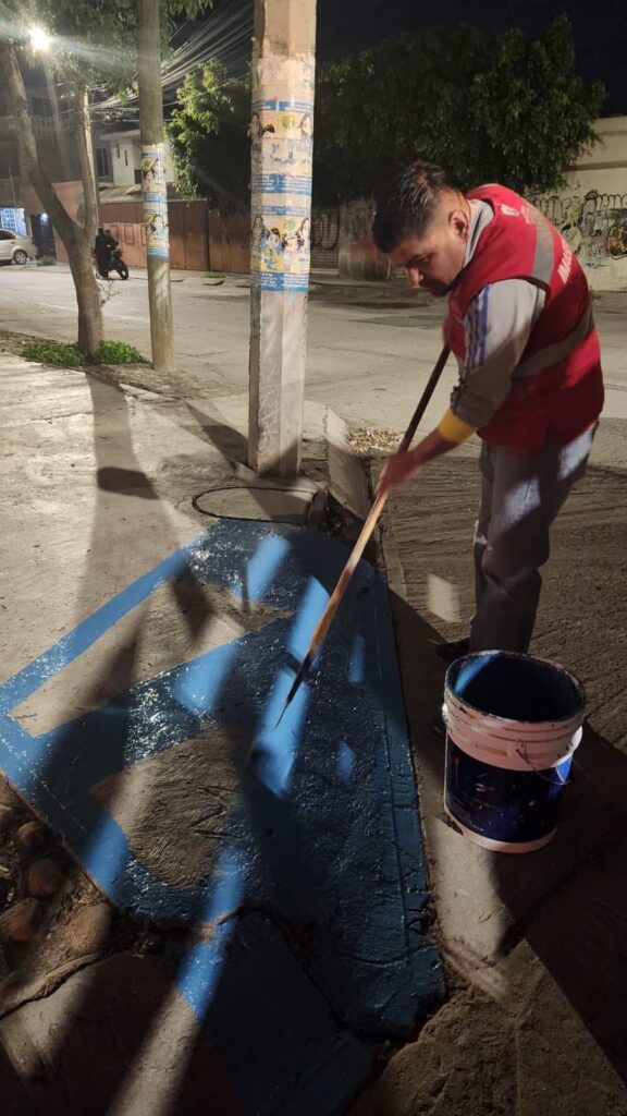 Otro punto fue la colonia del Llano, en la que se colocó pintura nueva en pasos peatonales y rampas para personas con discapacidad, para brindar más seguridad y accesibilidad a las vecinas y vecinos de la zona. En los trabajos participan las áreas de Imagen Urbana, Parques y Jardines y Alumbrado Público.