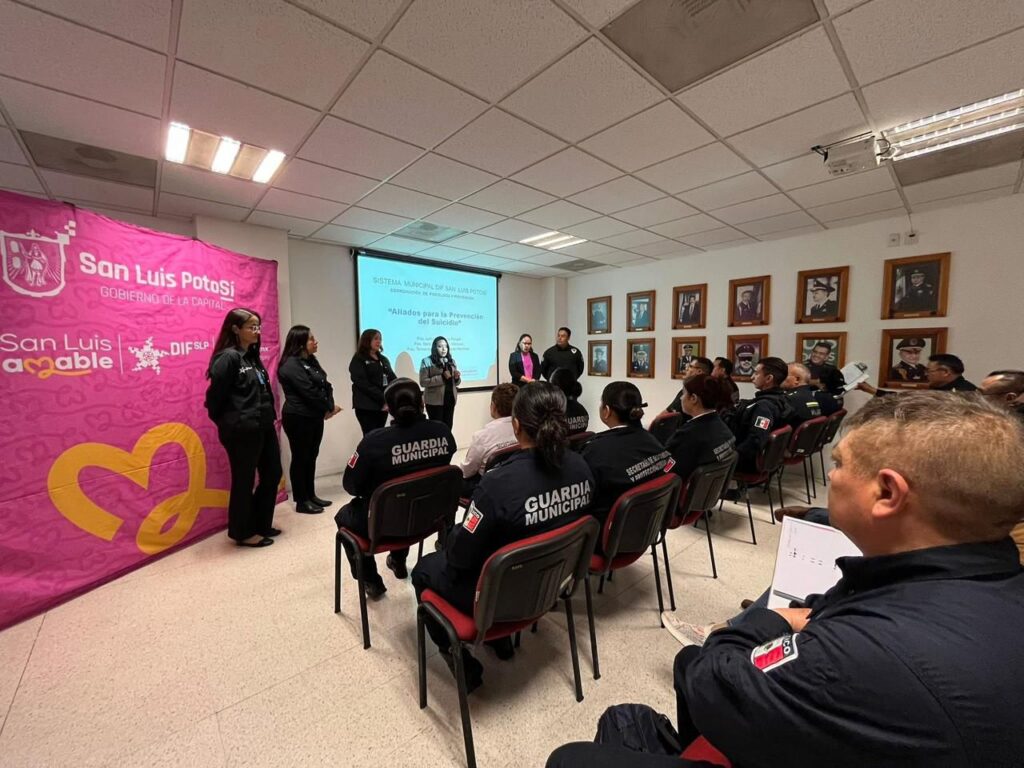 SLP.- Con el firme compromiso de velar por la salud mental y prevenir situaciones de riesgo en la población, el Ayuntamiento de San Luis Potosí, en colaboración con el DIF Municipal, llevó a cabo una capacitación dirigida a los elementos de la Secretaría de Seguridad y Protección Ciudadana, en el marco del programa “Aliados para la Prevención del Suicidio”.