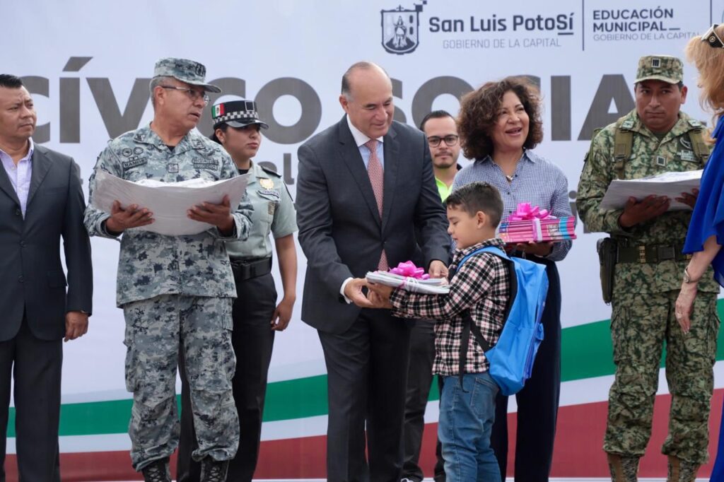 En el inicio de actividades, el Alcalde capitalino encabezó el Lunes Cívico Social en la Plaza de Los Fundadores para rendir honores a los simbolos patrios, junto con la presidenta del DIF Municipal, Estela Arriaga Márquez y el coordinador estatal de la Guardía Nacional, General Brigadier Gaudencio Ramos Jiménez, donde se resaltó la importancia de impulsar no sólo mejores prácticas docentes, sino también fomentar el respeto a los valores cívicos.