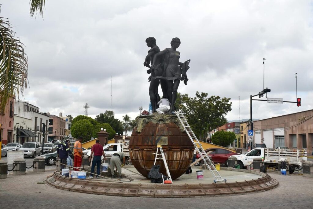 Por instrucciones del Alcalde Enrique Galindo Ceballos, la Unidad de Gestión del Centro Histórico (UGCH) y la Dirección de Servicios Municipales realizan de manera coordinada la intervención en la escultura monumental El Tercer Milenio, también conocida como la fuente de las Tres Musas o Tres Épocas, del escultor Ricardo Motilla, ubicada en la Plaza del Milenio, en el Centro Histórico de la ciudad.